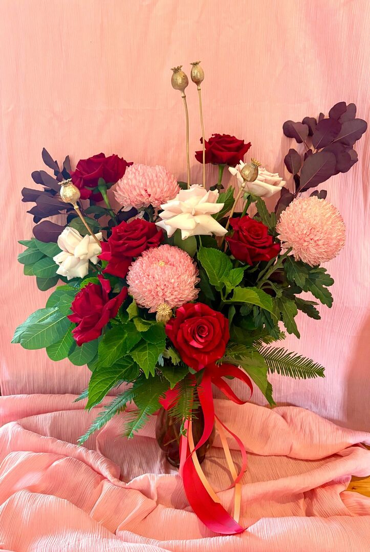 Nothing says 'I love you' like a gorgeous vase arrangement of the most beautiful premium longstem roses. Paired with Disbuds for some drama and accented with gorgeous seasonal foliages.