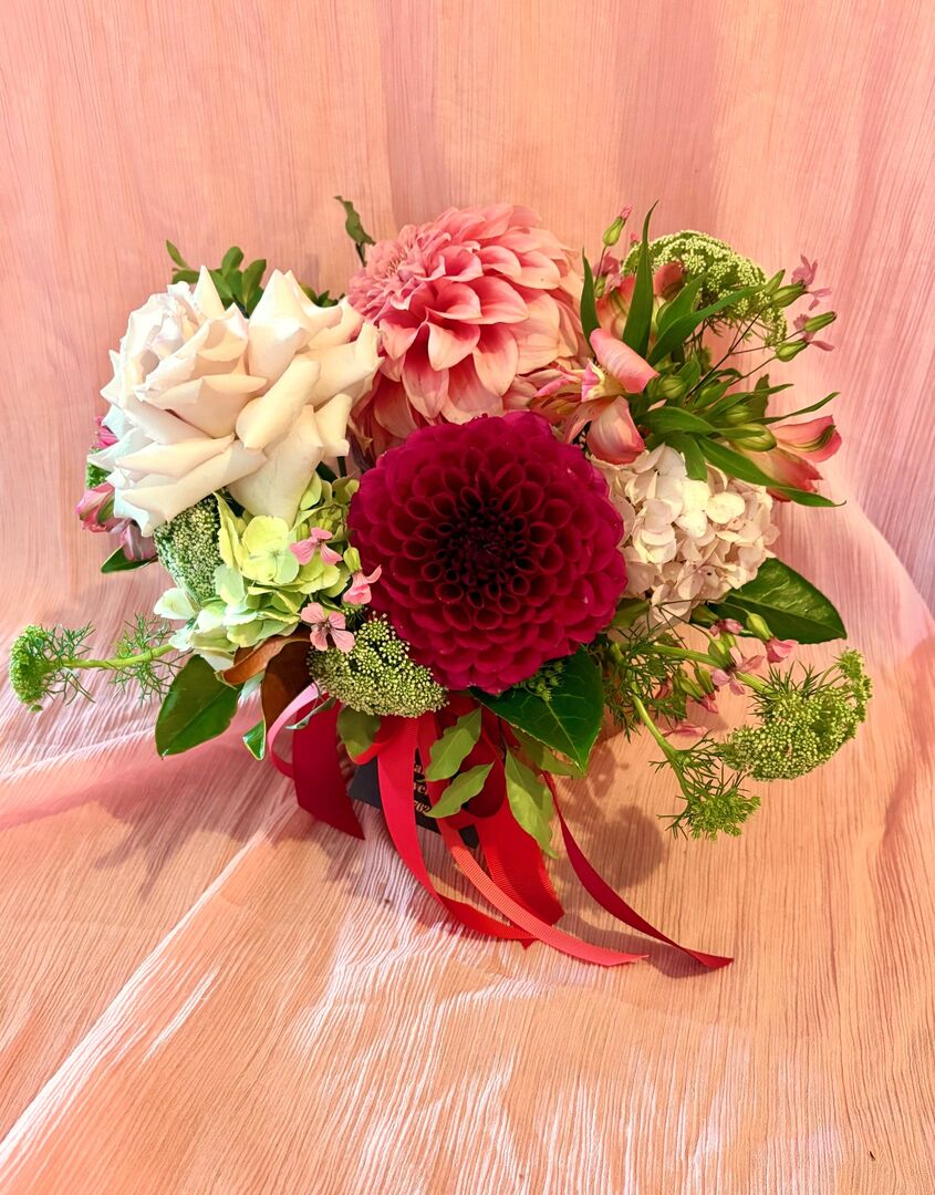 Just looking for a little something to show you care? This Valentine's themed mini jar will do the trick! Filled with our choice of seasonal blooms and presented in a small pink glass jar.